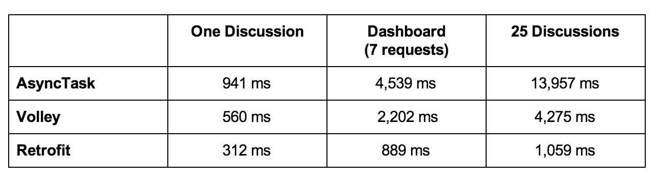 In all three tests with varying repeats (1 – 25 times), Volley was anywhere from 50% to 75% faster. Retrofit clocked in at an impressive 50% to 90% faster than the AsyncTasks, hitting the same endpoint the same number of times. On the Dashboard test suite, this translated into loading/parsing the data several seconds faster. That is a massive real-world difference. In order to make the tests fair, the times for AsyncTasks/Volley included the JSON parsing as Retrofit does it for you automatically.